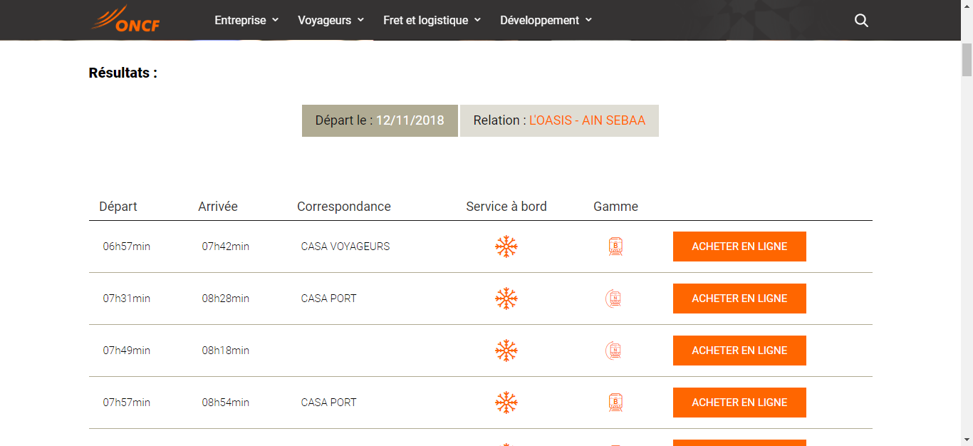 Les différents trajets s’affichent, sélectionnez votre horaire et cliquez ensuite sur « Acheter en ligne ».