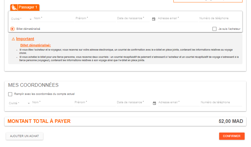 A cette étape, le récapitulatif de votre voyage s’affiche et vous devez renseigner vos coordonnées : civilité, nom, prénom, date de naissance et adresse mail. Cliquez ensuite sur le bouton « Confirmer ».