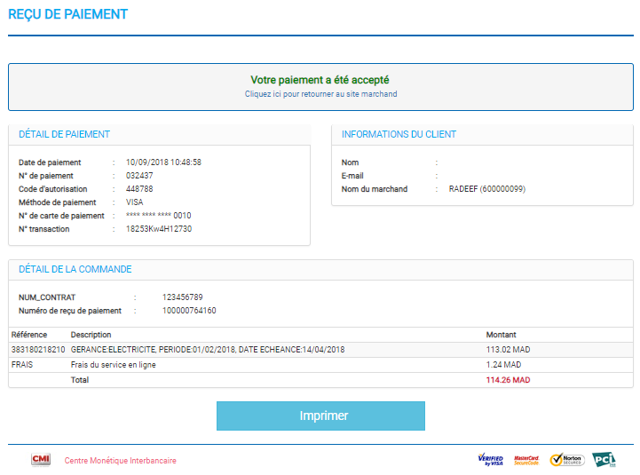 Il est à noter que le montant des frais du service de paiement en ligne est proportionnel au montant des factures choisies, et est ajouté au montant total payé par le client.