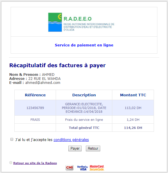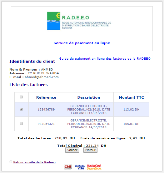 Il est à noter que le montant des frais du service de paiement en ligne est proportionnel au montant des factures choisies, et sera ajouté au montant total payé par le client.