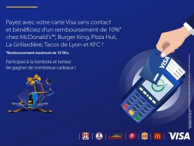 Ainsi, du 07/06/2021 au 27/06/2021, pour les premiers paiements sans contact dans les restaurants Mc Donald's, Burger King, Pizza Hut, La Grillardière, Tacos de Lyon et KFC, les détenteurs de carte Visa bénéficieront d'un remboursement de 10%.